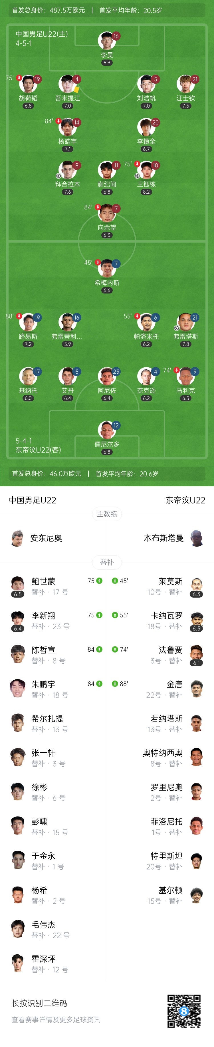 第42分钟,中国队获得前场右路任意球,皮球前点被对手蹭了一下,后点拜合拉木破门,U22国足1比0领先东帝汶。