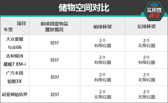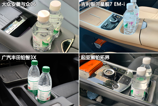 杯架测试环节,吉利银河星舰7 EM-i表现不错,前后排各配备2个杯架,并且均带有限位器。其余三款车型的杯架数量和布局与吉利银河星舰7 EM-i保持一致,其中大众安徽与众06和广汽丰田铂智3X的后排杯架未配备限位器,而起亚狮铂拓界的所有杯架均未配备限位器,无法有效固定水杯或水瓶。