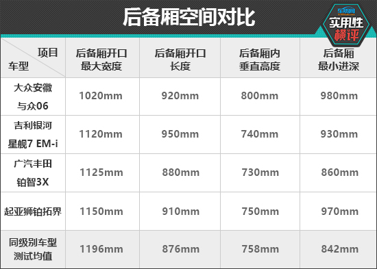 后备厢方面,四款车型的后备厢造型较为规整,地板平整度也不错,实用性表现均令人满意。其中,大众安徽与众06整体表现更好,有三项数值超过了同级别车型测试均值。相比之下,其余三款车型在后备厢开口长度和后备厢最小进深方面成绩突出,均超过了同级别车型测试均值。