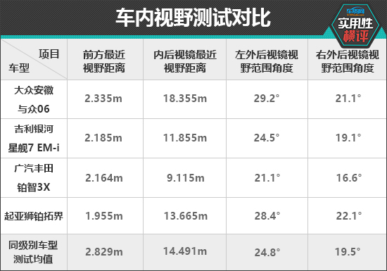 在安全测试环节,我们针对车辆日常使用过程中最常用到的视野范围进行了测量和比对。测试过程中,车内所有座椅均已调整至最低状态,所测出的数据与驾驶者正常使用时均有一些偏差,仅供参考。