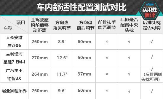 主驾驶座椅前后移动距离方面,吉利银河星舰7 EM-i以270mm的测试成绩排名第一,而大众安徽与众06和起亚狮铂拓界的测试数据均为260mm,表现略逊色于另外两款车型。方向盘调节方面,吉利银河星舰7 EM-i以微弱优势取胜,前后可调节距离处于同级别中游水平,上下可调节角度则达到同级别上游水平。相比较而言,广汽丰田铂智3X测试成绩垫底,主要原因在于其方向盘前后可调节距离与同级别车型测试均值差距较大。