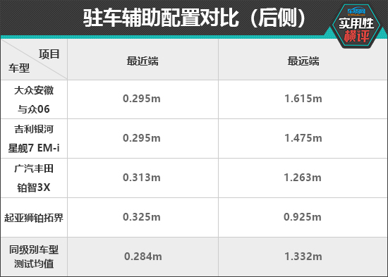 在后驻车雷达测试中,大众安徽与众06再度胜出,最远探测距离达到1.615m,雷达功率表现不错。在最近提示距离方面,大众安徽与众06和吉利银河星舰7 EM-i测试数值完全一致,与同级别车型测试均值更加接近。