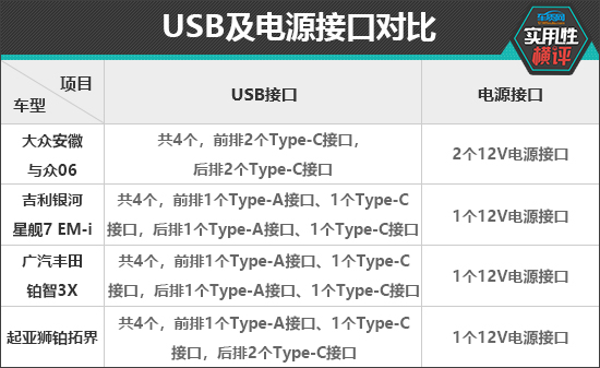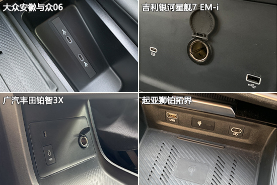 充电接口方面,四款车型均配备4个USB接口,其中吉利银河星舰7 EM-i和广汽丰田铂智3X前后排接口涵盖Type-A和Type-C两种类型,实用性表现更好。起亚狮铂拓界前排提供了1个Type-A接口和1个Type-C接口,后排则配备了2个Type-C接口,兼容性表现不如前排。而大众安徽与众06前后排均为Type-C单一类型的接口,对于移动设备的兼容性较差。此外,四款车型均配备12V电源接口,其中大众安徽与众06全车提供了2个12V电源接口,可以更好地满足用电需求。