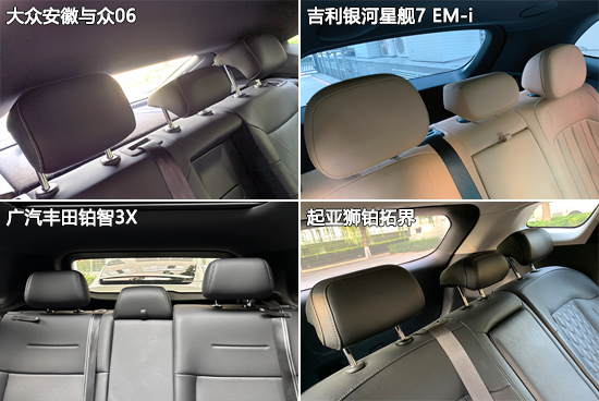 车内舒适性方面,四款车型后排均配备了三个独立头枕,整体表现令人满意。从造型来看,四款车型后排中间头枕的面积均略小于两侧头枕,不过对枕靠舒适性影响不大。具体功能方面,由于广汽丰田铂智3X的后排中间头枕不支持高低调节,因此对于不同身高的乘员适应性较差,而另外三款车型的后排中间头枕均可调节。