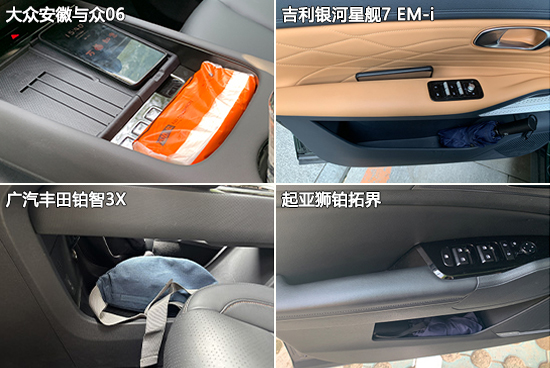 车内储物空间方面,四款车型整体表现均可圈可点,上述固定物品除墨镜外,其余物品都能找到合适的储物空间进行摆放,并且位置设计合理,拿取物品十分方便。
