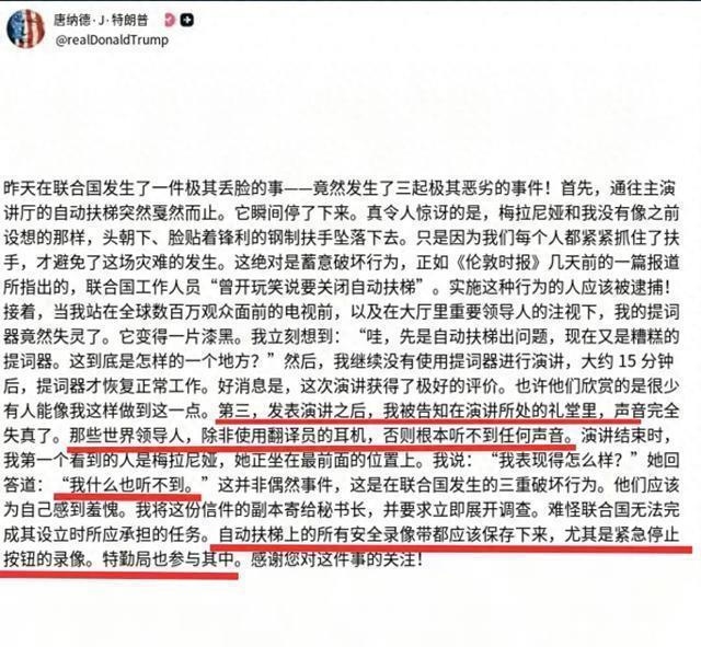 联合国大会之后,特朗普在联大的发言受到了新一轮的围剿,其中巴西总统卢拉,法国马克龙,哥伦比亚总统佩特罗,在联合国讲台上和特朗普直面交锋,毫不掩饰对华盛顿的不满。其余没有上台的各国代表团队则是报以热烈的掌声,回敬这三位勇敢的总统。 而多个国家在联合国上表态,承认巴勒斯坦支持两国方案,这也让特朗普大为恼火。于是就开始了在联大长达57分钟的发言,怒喷联合国。不过遗憾的是此举没有起到震慑的作用,反倒进一步引发了各国的不满,以及世界媒体的嘲讽。 特朗普意识到收拾不了众多成员国,于是不顾联合国做出解释的情况下,将矛头再一次对准联合国。9月25日特朗普再次在社交平台朝联合国发难。表示自己在联合国遭受了三大屈辱。 除了电梯,提词器,自己在联合国的发言,现场的代表根本就听不到,特朗普表示这不是巧合,而是联合国对他的三重破坏,并且表示特勤局已经介入。用不了多久事情将会水落石出。行凶作恶的人将会受到惩罚。